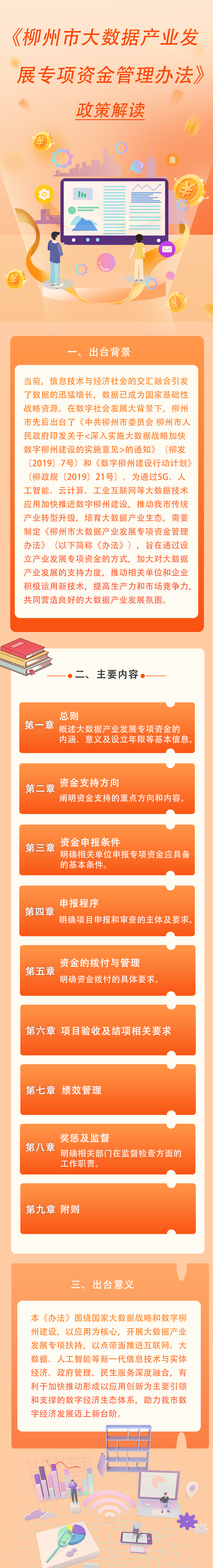 当前,信息技术与经济社会的交汇融合引发了数据的迅猛增长,数据已成为国家基础性战略资源。在数字社会发展大背景下,柳州市先后出台了《中共柳州市委员会 柳州市人民政府印发关于<深入实施大数据战略加快数字柳州建设的实施意见>的通知》(柳发〔2019〕7号)和《数字柳州建设行动计划》(柳政规〔2019〕21号)。为通过5G、人工智能、云计算、工业互联网等大数据技术应用加快推进数字柳州建设,推动我市传统产业转型升级,培育大数据产业生态,需要制定《柳州市大数据产业发展专项资金管理办法》(以下简称《办法》),旨在通过设立产业发展专项资金的方式,加大对大数据产业发展的支持力度,推动相关单位和企业积极运用新技术,提高生产力和市场竞争力,共同营造良好的大数据产业发展氛围。
