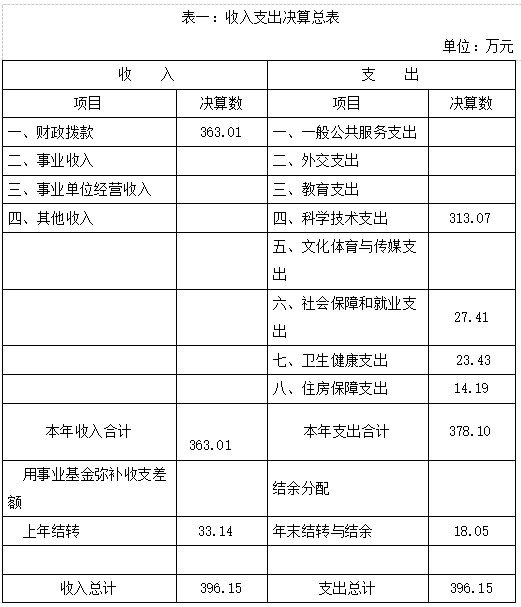 2019年度收入总计363.01万元,支出总计378.10万元,年末结转和结余18.05万元,与2018年相比,收入增加14.20万元,增长4.07%;支出增加32.17万元,增长9.30%。