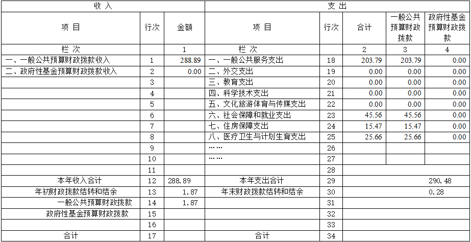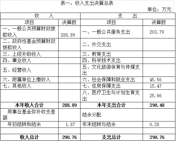 本部门2019年度财政拨款收、支总决算288.89万元、290.48万元。与2018年相比,财政拨款收入增加41.28万元,增长16.67%;支出增加41.52,增长16.67%。