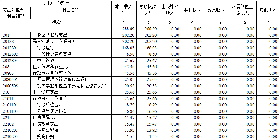 本年收入总计288.89万元(逐项说明) ,其中:一般公共预算财政拨款收入288.89万元;占比100%;政府基金预算财政拨款收入0万元;占比0%;上级补助收入0万元,占比0%;事业收入0万元,占比0%;事业单位经营收入0万元,占比0%;其他收入0万元,占比0%。