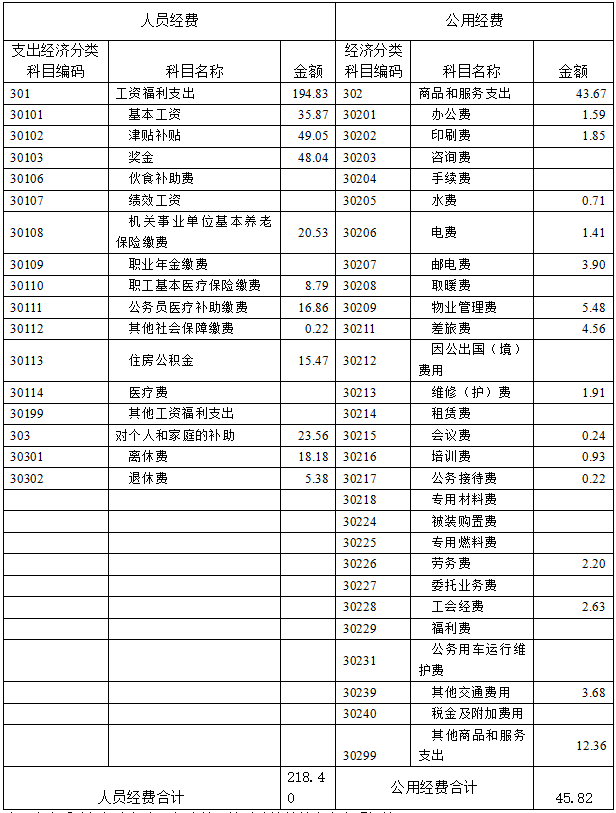 人员经费218.40万元,主要包括:基本工资、津贴补贴、 奖金、伙食补助费、绩效工资、机关事业单位基本养老保险缴费、职业年金缴费、其他社会保障缴费、其他工资福利支出、 离休费、退休费、抚恤金、生活补助、医疗费、奖励金、住房公积金、购房补贴、其他对个人和家庭的补助支出;