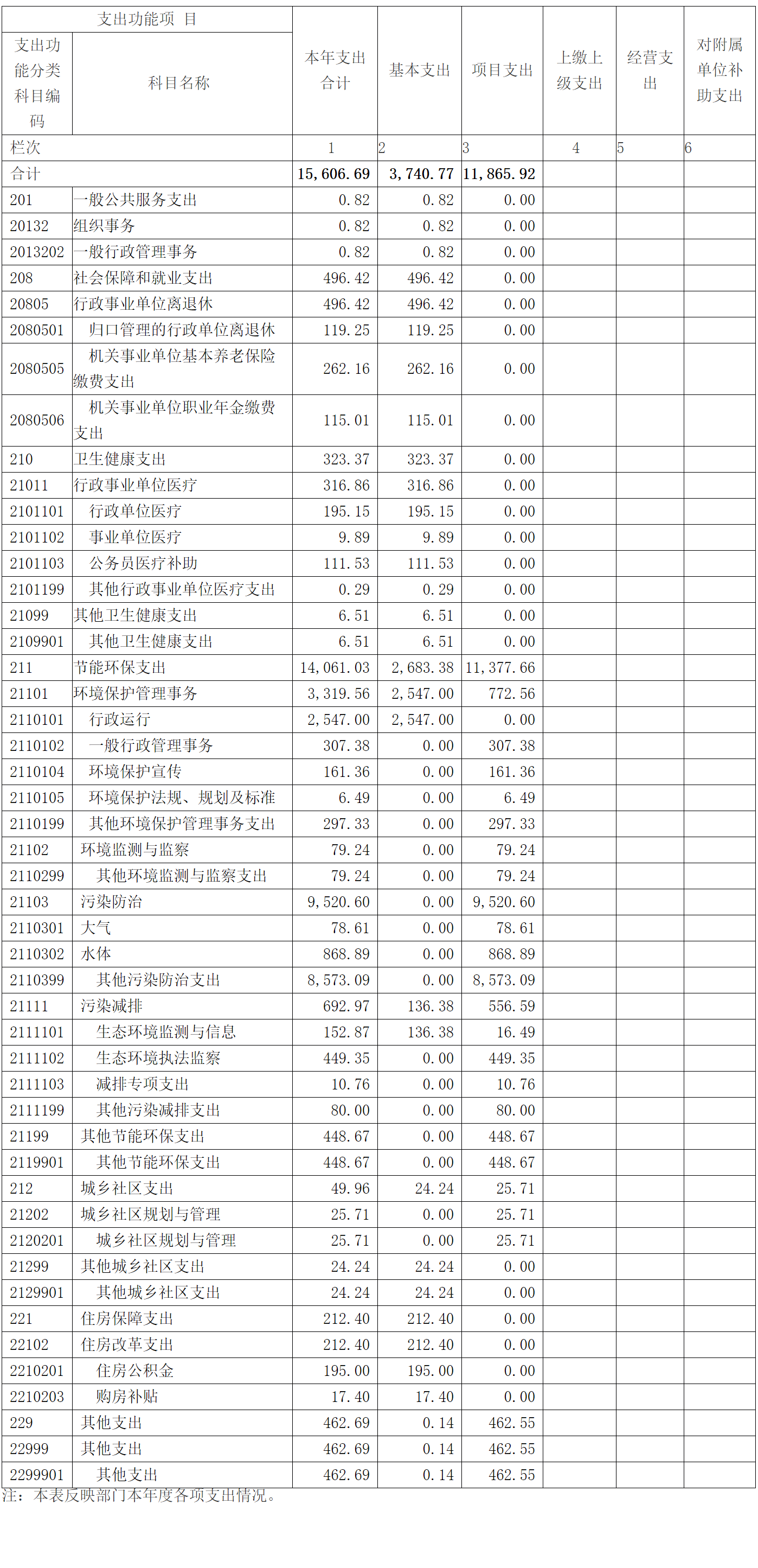 本年支出合计15606.69万元,其中:基本支出3740.77万元,占23.97%;项目支出11865.92万元, 占76.03%;经营支出0万元,占0%。