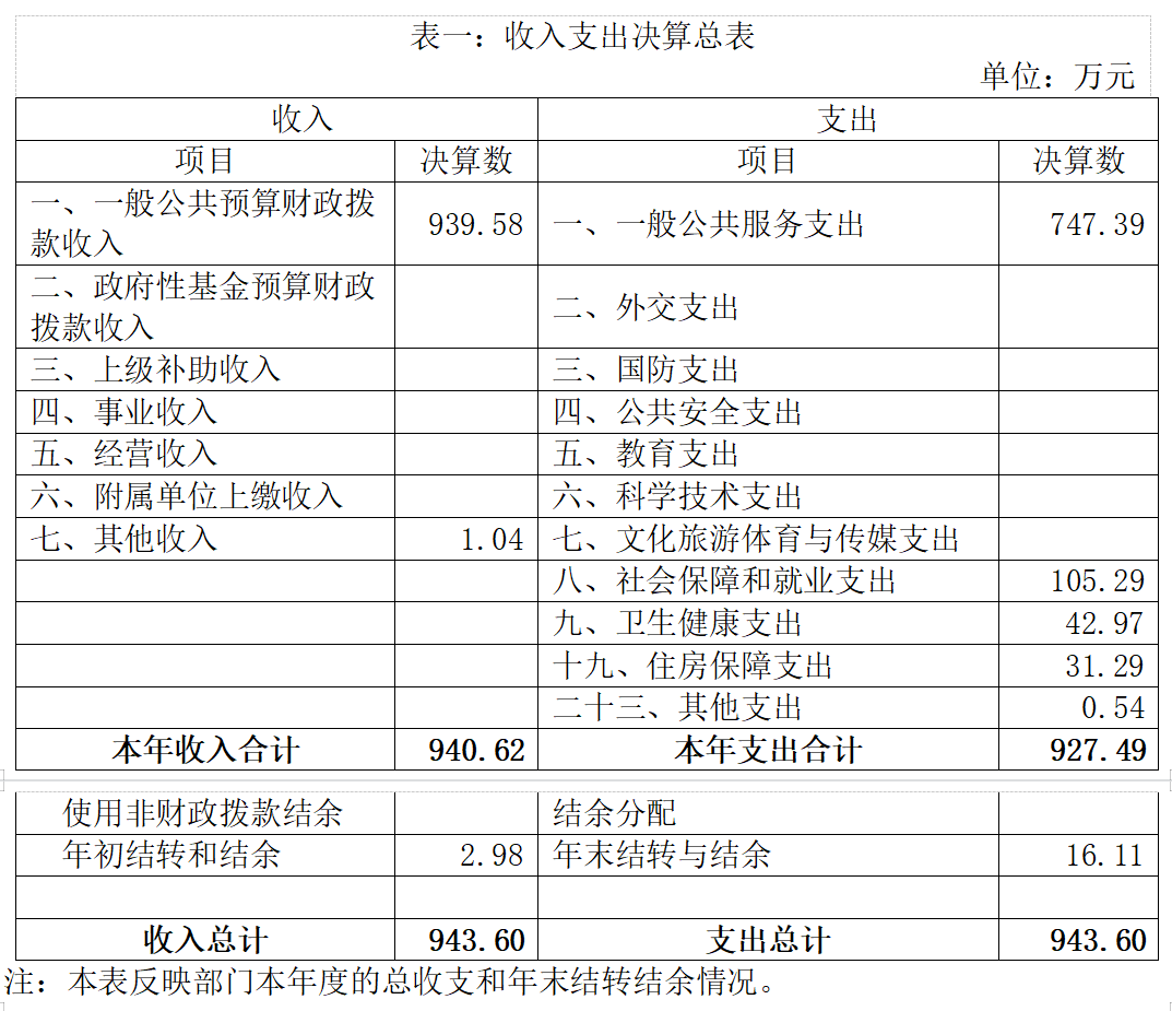 本年收入总计940.62万元 ,其中:一般公共预算财政拨款收入939.58万元;占比99.89%;其他收入1.04万元,占比0.11%。