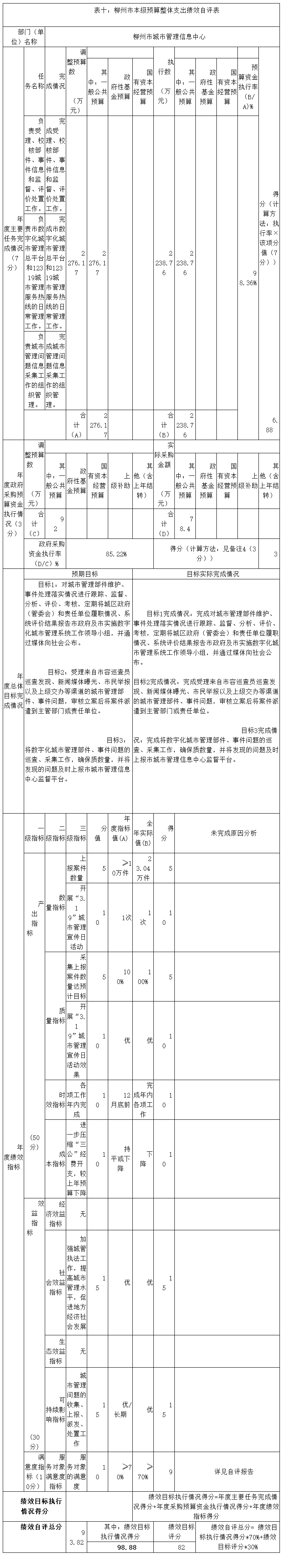 我部门根据年初设定的绩效目标,柳州市城市管理信息中心整体支出绩效自评得分为93.82分。发现的主要问题及原因:效益指标编制不够全面。下一步改进措施:细化绩效指标,提高指标设置的科学性、完整性。
