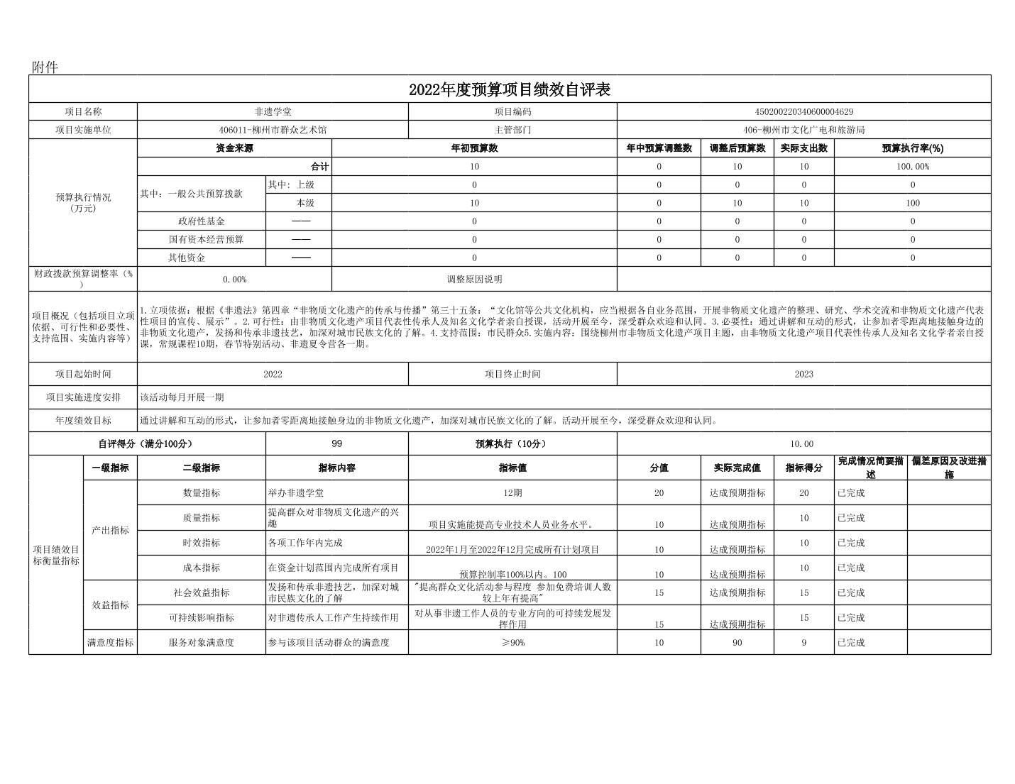 我单位根据年初设定的绩效目标,非遗学堂项目自评得分为99分。
