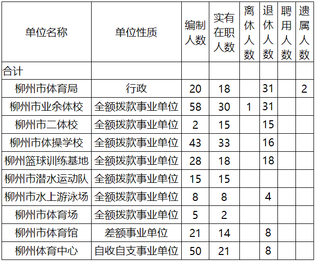 柳州市体育局预算实行综合预算,反映体育局机关和九个下属事业单位以及柳州市老年体育协会所有的收入和支出预算。