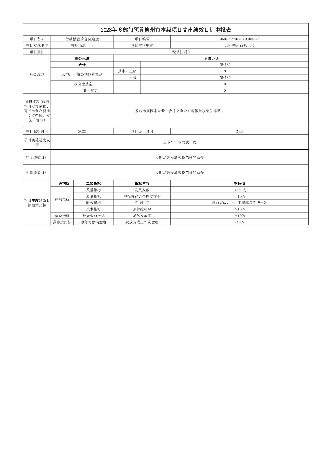 柳州市总工会2023年劳动模范荣誉奖励金项目支出绩效目标申报表.xls