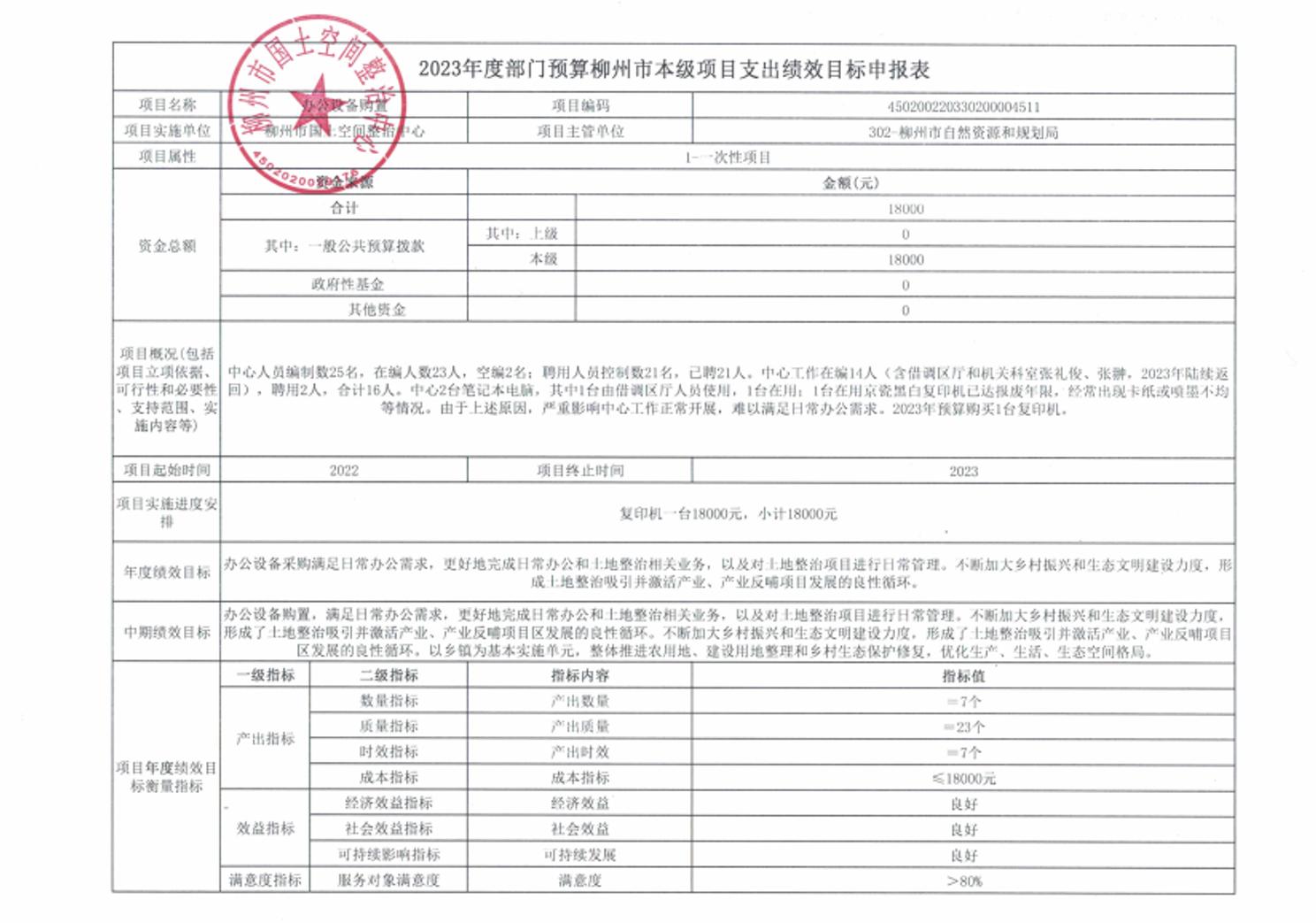 柳州市国土空间整治中心2023年办公设备采购项目支出绩效目标申报表.xls