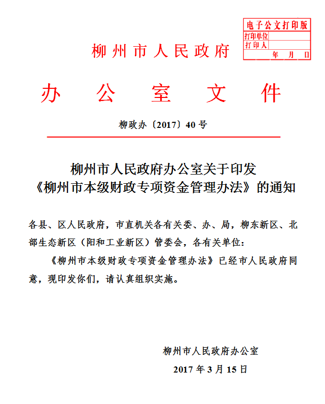 柳政办【2017】40号 柳州市人民政府办公室关于印发 《柳州市本级财政专项资金管理办法》的通知.doc