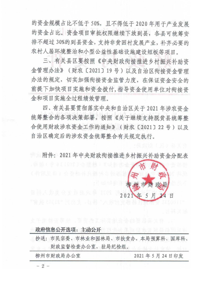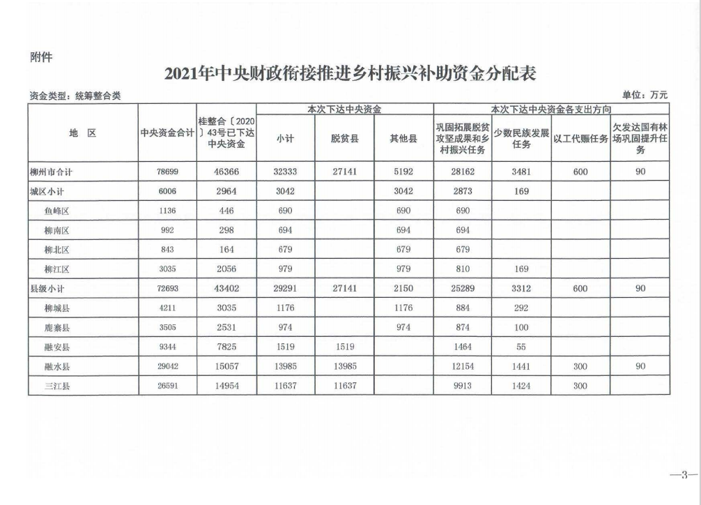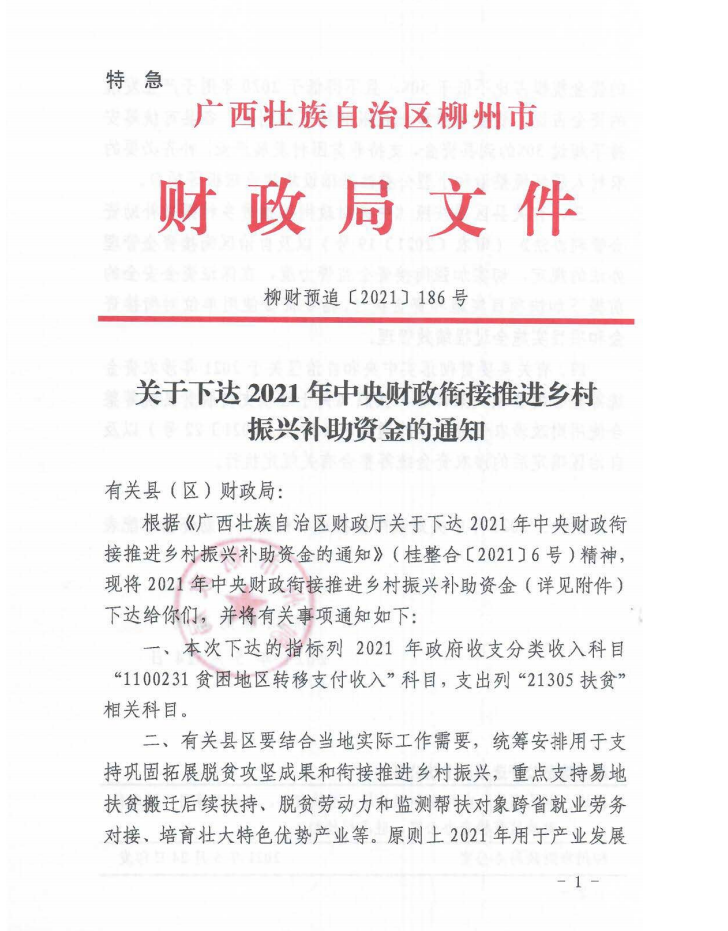 柳财预追〔2021〕186号 关于下达2021年中央财政衔接推进乡村振兴补助资金的通知