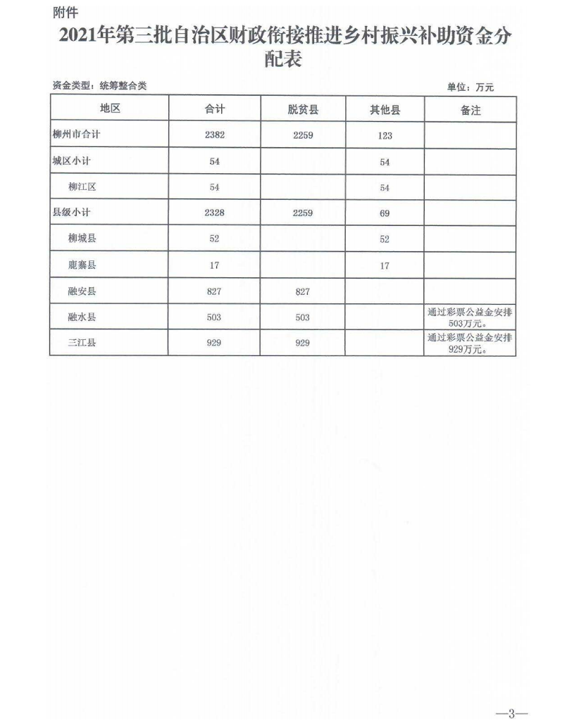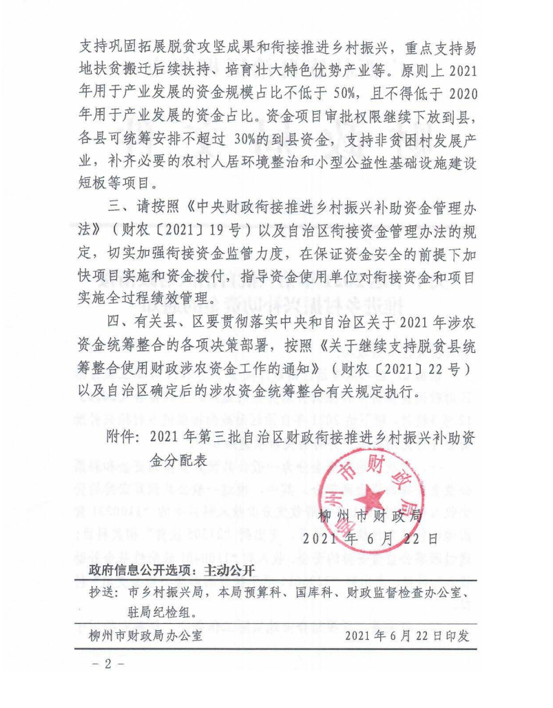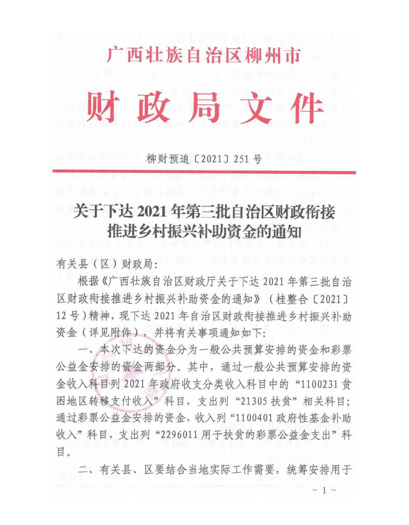 柳财预追〔2021〕251号 关于下达2021年第三批自治区财政衔接推进乡村振兴补助资金的通知
