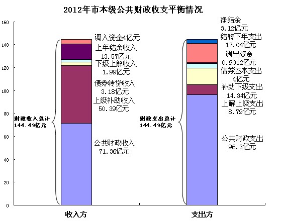 2012年,市本级当年财政总收入130.92亿元,加上年结余收入13.57亿元,减当年财政总支出124.33亿元,减结转(专项结转)下年支出17.04亿元,年终净结余3.12亿元。年终净结余决算数比预算报告数增加7858万元,主要是上级补助收入增加1.04亿元,上解上级支出减少3750万元,下级上解收入增加2382万元,补助下级支出增加4063万元,从而增加了净结余。结转下年支出增加4485万元,主要是增加了自治区下达专项拨款补助结转。