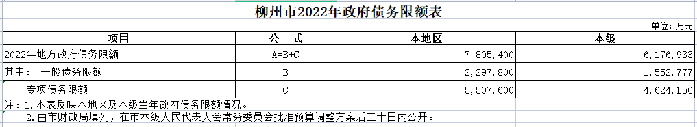 柳州市2022年政府债务限额表