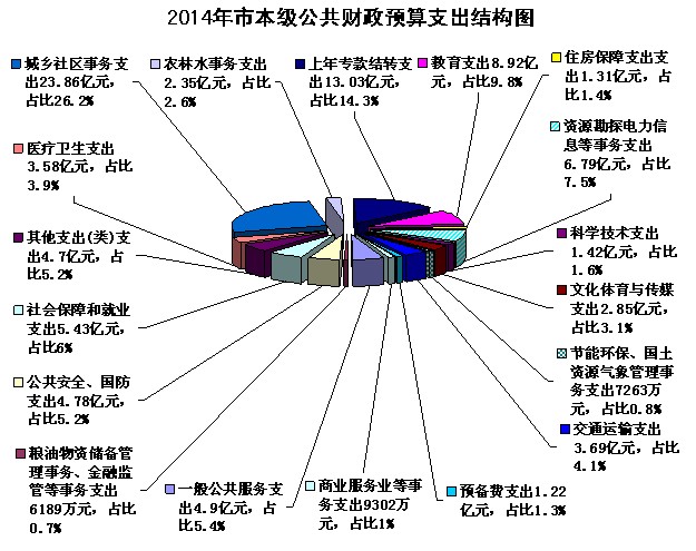 2014年市本级财政总支出的构成:(1)公共财政预算支出91.1亿元(含上年专款结转支出13.03亿元);(2)上解自治区支出9.1亿元;(3)补助下级财政支出10.87亿元;(4)调出资金1.18亿元。