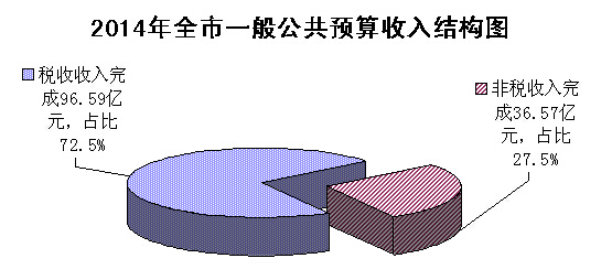 全市一般公共预算收入133.16亿元,同比增加8.04亿元,增长6.4%,其中:税收收入完成96.59亿元,同比增加10亿元,增长11.5%;非税收入完成36.57亿元,同比减少1.96亿元,下降5.1%;非税收入占一般公共预算收入比重27.5%,较上年下降3.3个百分点。