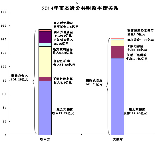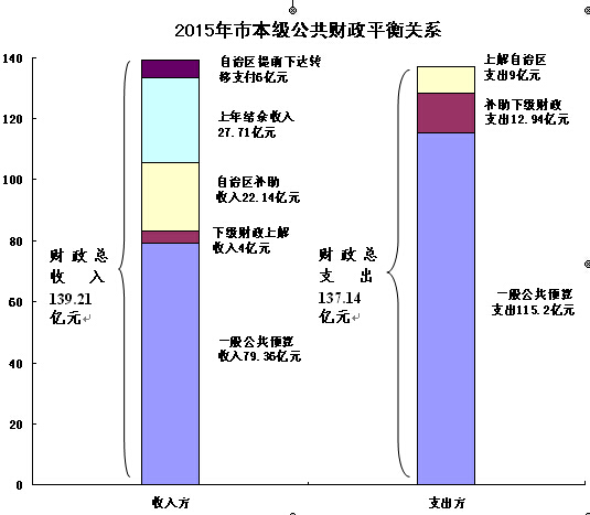 市本级财政总收入的构成:(1)一般公共预算收入79.36亿元;(2)自治区补助收入22.14亿元,其中:返还性收入18.2亿元,一般性转移支付收入3.94亿元;(3)下级财政上解收入4亿元;(4)上年结余收入27.71亿元(含转列一般公共预算的政府性基金结余收入14.95亿元);(5)自治区提前下达2015年转移支付收入6亿元。