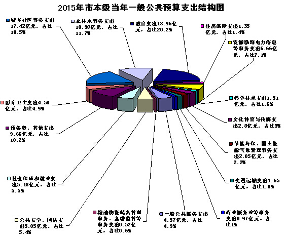 2015年市本级一般公共预算安排支出总计115.2亿元,其中:当年一般公共预算支出93.91亿元,2014年专款结转支出15.29亿元(含转列一般公共预算的政府性基金结转支出3.29亿元),自治区提前下达2015年转移支付支出6亿元。