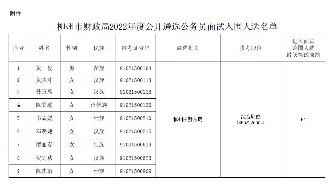根据柳州市遴选机关笔试合格分数线和计划遴选人数与面试入围人选1∶3的比例,按照同一职位报考人员笔试成绩从高分到低分的顺序,确定黄俊等9名报考人员为面试入围人选(具体人员名单见附件)。