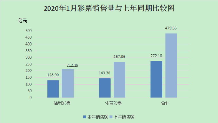1月份,全国共销售彩票272.10亿元,比上年同期(简称“同比”)减少207.45亿元,下降43.3%。其中,福利彩票机构销售128.90亿元,同比减少83.28亿元,下降39.3%。体育彩票机构销售143.20亿元,同比减少124.16亿元,下降46.4%。1月份彩票销量同比下降较多主要原因是,春节期间彩票休市、部分游戏规则调整带来彩票销量下滑的政策影响继续显现,以及2019年1月受亚洲杯影响,体育彩票竞猜型彩票游戏销量大,上年同期基数较高等。
