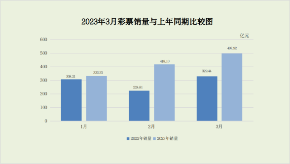3月份,全国共销售彩票497.92亿元[1],同比增加168.48亿元,增长51.1%。其中,福利彩票机构销售154.25亿元,同比增加21.15亿元,增长15.9%;体育彩票机构销售343.67亿元,同比增加147.33亿元,增长75.0%。主要受体育赛 事带动效应、竞猜赛事较上年同期增加及彩票游戏促销等因素影响。