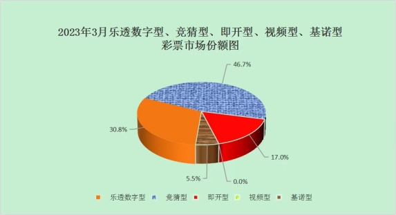 3月份,乐透数字型彩票销售153.43亿元,同比增加11.84亿元,增长8.4%;竞猜型彩票销售232.62亿元,同比增加125.24亿元,增长116.6%;即开型彩票销售84.53亿元,同比增加27.45亿元,增长48.1%;基诺型彩票销售27.34亿元,同比增加3.96亿元,增长16.9%。3月份,乐透数字型、竞猜型、即开型、基诺型彩票销售量分别占彩票销售总量的30.8%、46.7%、17.0%、5.5%。视频型彩票销售0.0005亿元,同比减少0.0006亿元。