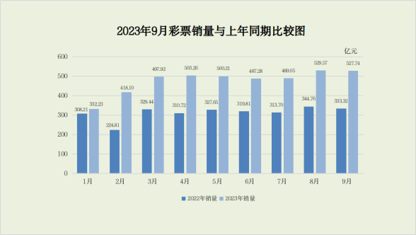 9月份,全国共销售彩票527.74亿元[1],同比增加194.42亿元,增长58.3%。其中,福利彩票机构销售182.13亿元,同比增加58.94亿元,增长47.9%;体育彩票机构销售345.61亿元,同比增加135.48亿元,增长64.5%。主要受亚运会等重大赛事增多、即开型彩票新票上市、新渠道拓展等因素影响,彩票销量较上年同期增长较快。