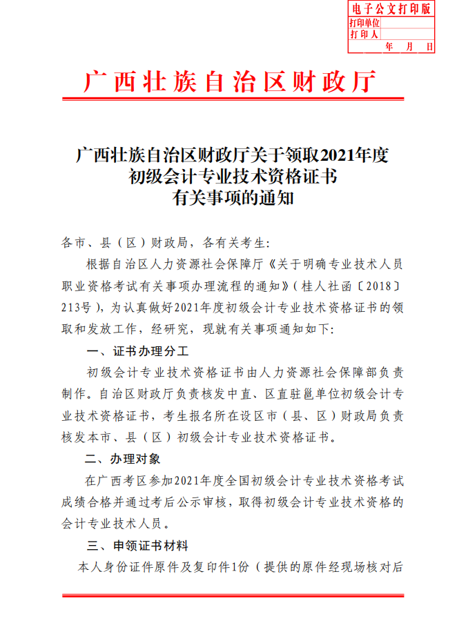 广西壮族自治区财政厅关于领取2021年度初级会计专业技术资格证书有关事项的通知 - 会计信息 - 广西博彩公司网址网站