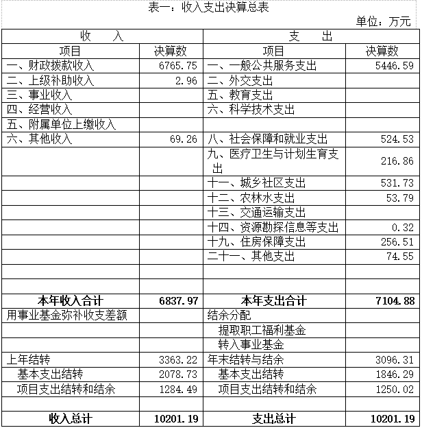 2018年度收入总计10201.19万元,支出总计10201.19万元,与2017年相比,收、支均增加1460.77万元;均增长16.71%。