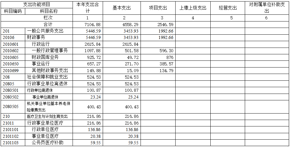 基本支出4558.29万元,占比64.16%;项目支出2546.59万元,占比35.84%。