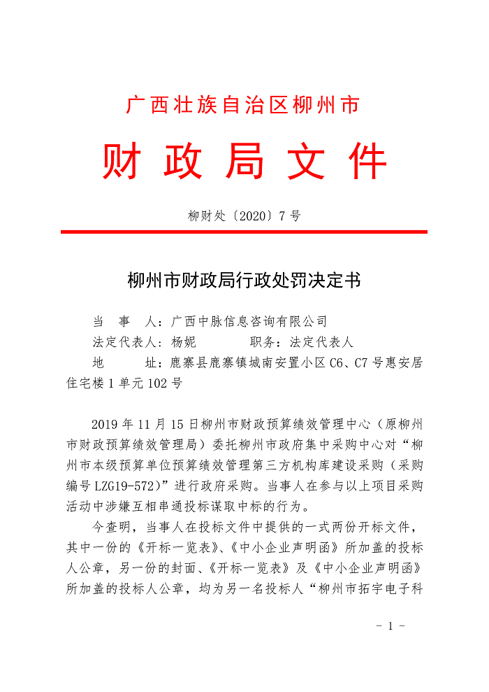 柳财处〔2020〕7号 博彩导航网行政处罚处理决定书 - 信用公示 - 广西博彩导航网网站