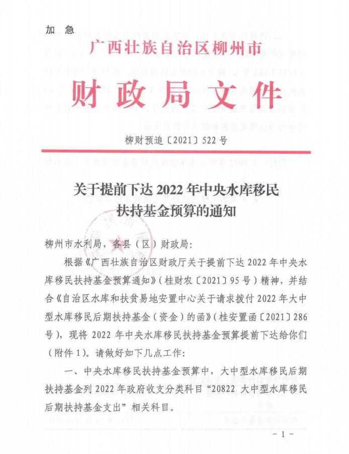 柳财预追〔2021〕522号 关于提前下达2022年中央水库移民扶持基金预算的通知 - 惠民惠农工作 - 广西博彩导航网网站